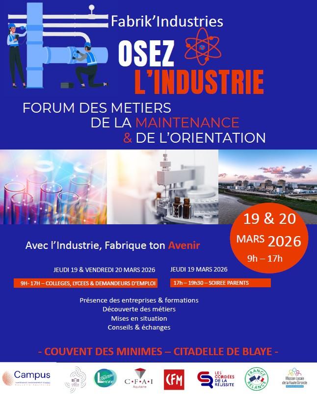 Les 19 et 20 mars, le forum FABRIK’INDUSTRIE vous donne rendez-vous au Couvent des Minimes, au cœur de la Citadelle de Blaye, pour deux journées dédiées à l’emploi, aux métiers et à l’orientation dans l’industrie.